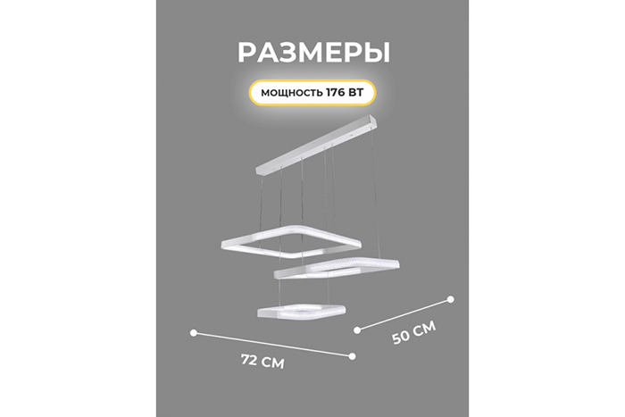 - Светодиодная подвесная люстра с тремя квадратами расположенными на одной потолочной площадке линейной формы. Лаконичное исполнение строгих линий в корпусе из металла с матовыми рассеивателями отлично дополнит современный интерьер и наполнит мягким, ярким светом современный интерьер. Регулировка яркости и цветовой температуры позволит настроить комфортный для Ваших глаз свет. Очень интересный визуальный эффект даёт необычное расположение рассеивателя в шахматном порядке: часть рассеивателя расположена внутри, а другая часть рассеивателя снаружи светильника.