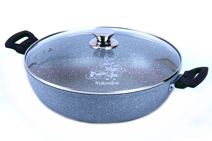 Сотейник "Kukmara" изготовлена из литого алюминия и покрыта инновационным антипригарным мраморным покрытием нового поколения на водной основе, усиленным сверхтвердыми частицами минералов.
