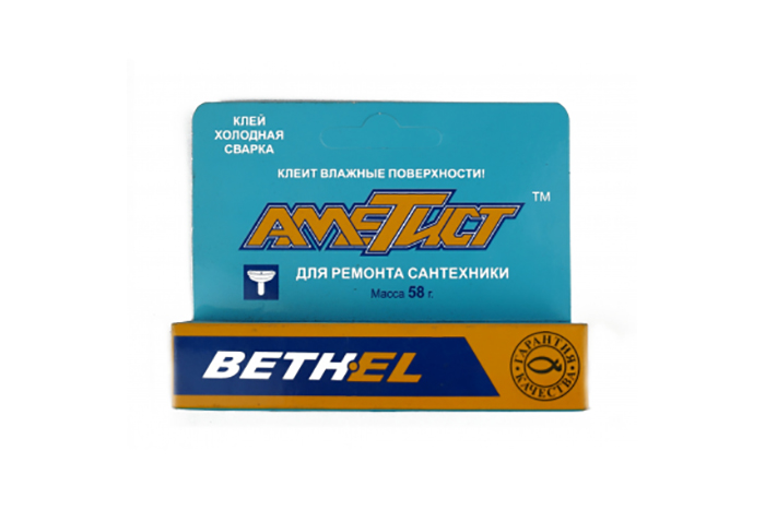 - Холодная сварка 'Аметист' для ремонта сантехники и трубопроводов. Предназначена для прочного и герметичного соединения сантехфаянса, деталей из металлов, пластмасс, стекла, керамики, мрамора. Соединяет разнородные материалы, обеспечивая высокую степень прочности соединения. Восстанавливает расколовшиеся керамические раковины, фаянсовые столешницы умывальников, треснувшие крышки смывных бачков и унитазные полочки, надколотые корпуса водных смесителей и другие элементы сантехники. Устраняет течи фитинговых соединений, свищи и продольные трещины в трубах, течи в ваннах и душевых поддонах. Перед применением необходимо отрезать нужное для ремонта количество состава и тщательно смешать его компоненты руками в перчатках до получения массы однородного цвета. При этом состав должен разогреться и стать пластичным. Время полного отверждения - 24 часа, после чего состав можно обрабатывать, сверлить, красить и т.д. Масса 58г.