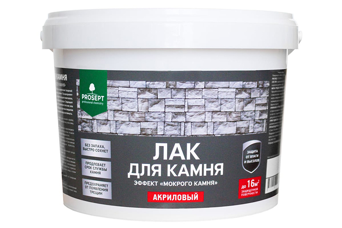 - Лак для камня PROSEPT - защитно-декоративный лак с эффектом "мокрого камня" на акриловой (водной) основе. Предохраняет от растрескивания и негативного воздействия влаги, пыли и агрессивной окружающей среды.