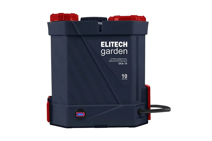 - Аккумуляторный ранцевый опрыскиватель ELITECH GARDEN ОСА 10 с баком на 10 литров и четырьмя сменными форсунками, со встроенной 12В свинцово-кислотной батареей применяется для распыления жидкостей при мойке и увлажнении поверхностей, полива и обработки растений, в том числе полностью растворимыми в воде химическими и биологическими препаратами (пестицидами).