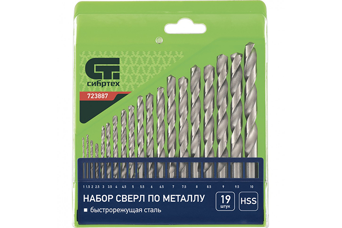 - Набор сверл по металлу Сибртех 723887 диаметром 1-10 мм (через 0,5 мм), из стали HSS, с цилиндрическим хвостовиком, состоит из 19 шт. и упакован в пластиковую коробку. Используется для получения отверстий в черных металлах, в том числе стали и чугуне. Большой выбор оснасток позволяет точно подобрать необходимый размер. Набор поставляется в надежном пластиковом боксе и пригодится во время строительства и ремонта, а также будет полезен для бытовых работ.