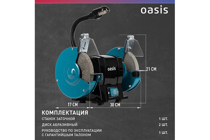 - Станок заточной Oasis ZS-30L предназначается для заточки и сухой шлифовки инструментов или прочих металлических предметов. Мощности двигателя хватит для домашней мастерской. 2 заточных круга разной зернистости добавляют удобства в работе.