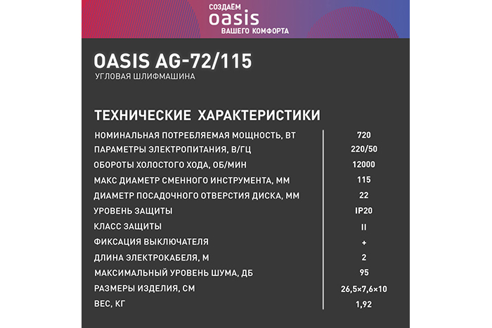 УШМ OASIS AG-72/115 NEW (720Вт, 115мм, 12000об/мин, 1,92кг)