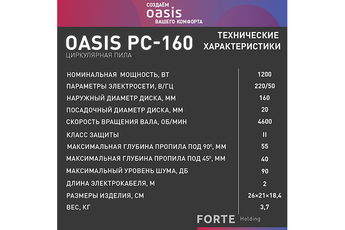 - Электрическая циркулярная пила Oasis PC-160 – это бытовой инструмент, предназначенный для продольного и поперечного распила под прямым углом, либо под углом до 45° древесины разных пород деревьев и изделий из древесных материалов. Широкий диапазон настроек работы инструмента и эргономичная рукоятка делают работу с пилой Oasis PC-160 максимально удобной. Высокая надёжность циркулярных пил Oasis достигается за счёт прочного корпуса и качественных материалов изготовления.