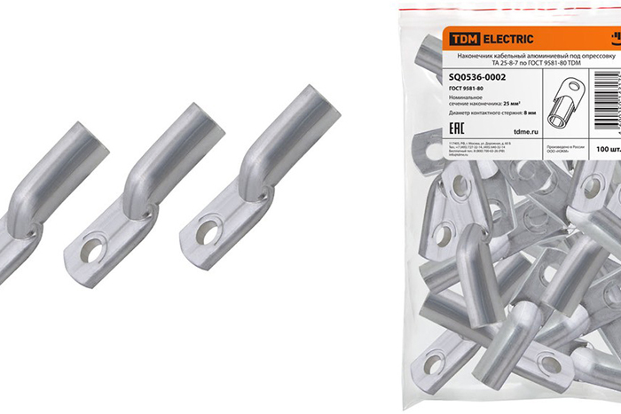 - Кабельные алюминиевые наконечники ТА применяются для оконцевания проводов и кабелей и их присоединении к алюминиевым шинам и выводам электротехнических устройств, напряжением до 35 кВ.