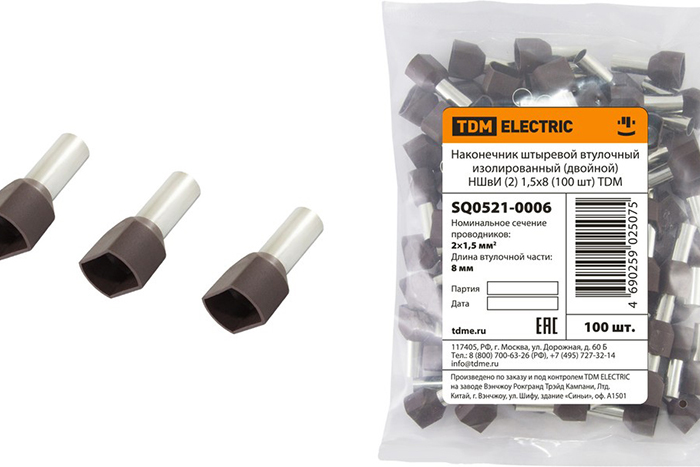 Наконечник штыревой изолированный (двойной) НШвИ (2) 1,5х8 коричневый (100 шт) TDM (0521-0006)