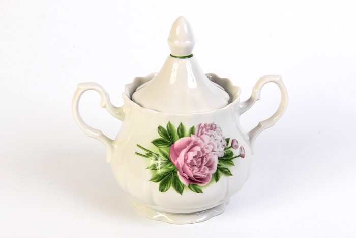 Великолепная сахарница "Пион", выполненная из высококачественного фарфора, оснащена крышкой и 2 ручками по бокам. Изделие украшено ярким цветочным рисунком.