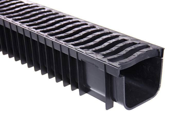 Лоток DN100 H100 комплектуется пластиковой решеткой. Нагрузка - пешеходная зона.