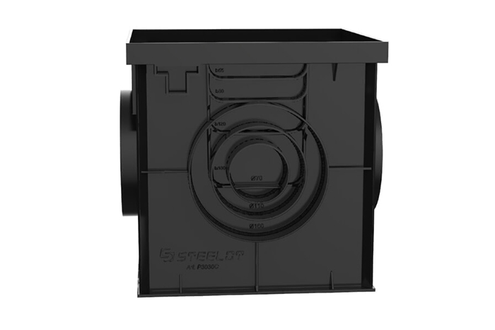Прямоугольная конструкция оснащена патрубками и шаблонами для монтажа труб и лотков. На верхней части расположены ответные пазы для фиксации защелок решетки. Отводы для труб расположены на дне и по всем стенкам. Возможно подключение пластиковых трубопроводов раструбной и фасонной частью.