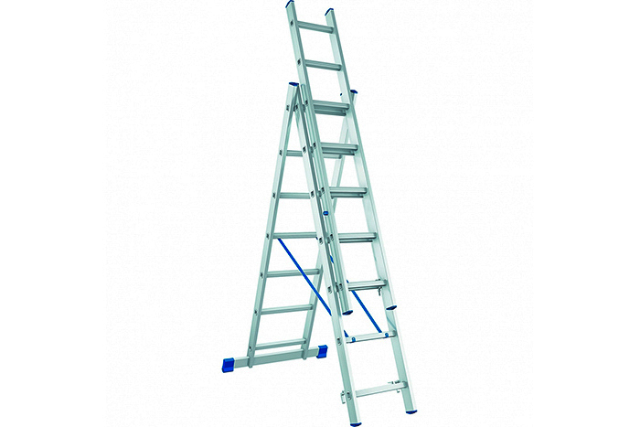 - Универсальная лестница трехсекционная может использоваться и как стремянка, и как раздвижная лестница. Две высокопрочные ленты и распорки с фиксацией служат для придания устойчивости опоре. Концы стойки с ножками лестницы предотвращают скольжение. Верхняя и центральная части оснащены защитным устройством, предохраняющим от случайного опускания и складывания. Компактная конструкция лестницы облегчает хранение и транспортировку. Легкое обслуживание, безопасное соединение под давлением.