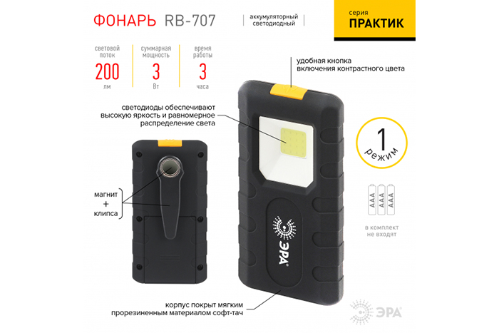 Фонарь ERA RB-707 серия "Практик" на батарейках, магнит, клипса - держатель (554) Фонарь ERA RB-707 серия "Практик" на батарейках, магнит, клипса - держатель (554) Фонарь ERA RB-707 серия "Практик" на батарейках, магнит, клипса - держатель (554)