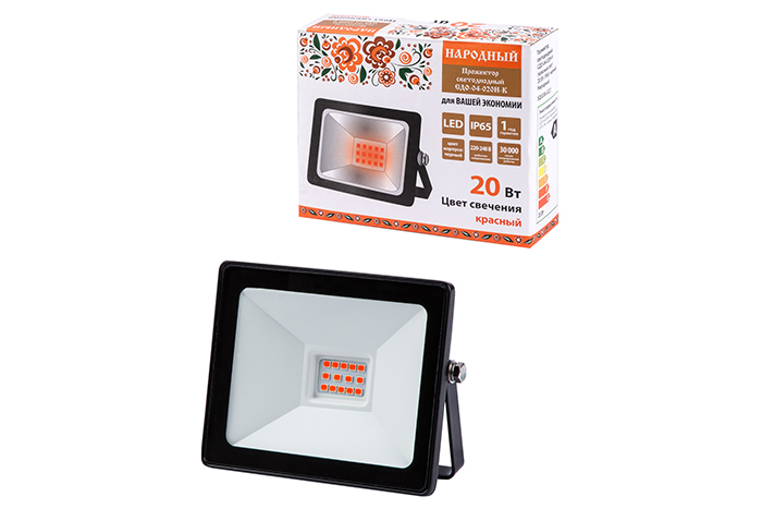 Прожектор светодиодный СДО-04-020Н-К (красный свет) 20 Вт, IP65, черный, Народный (0336-0221)