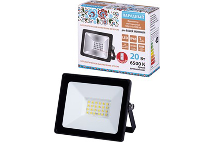 Прожектор светодиодный СДО-04-020Н-Ф (с фотореле) 20 Вт, 6500 К, IP65, черный, Народный (0336-0232)
