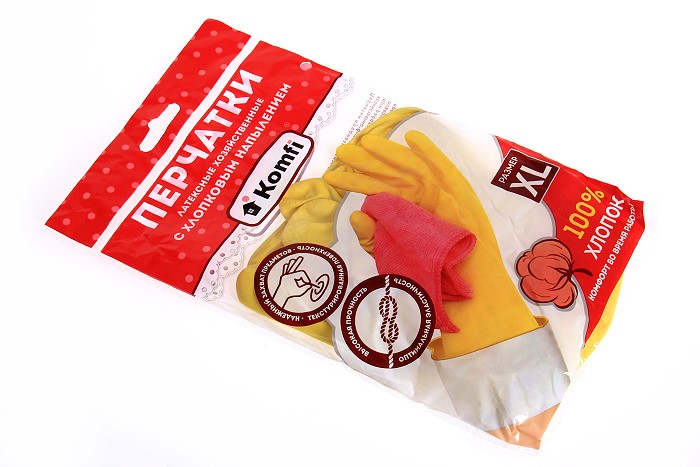 Перчатки хозяйственные латексные Komfi с х/б напылением желтые XL/120/10 DGL027P (389)