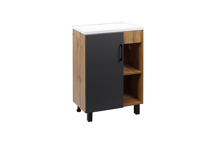 Тумба Лофт DORATIZ 9912.016, напольная, графит, ватан, под умывальник Сомо 60 - дизайн этой модели основан на сочетании ультрамодного цвета ватан и графит с черной матовой металлической фурнитурой. Тумба имеет распашную дверку, за которой удобно хранить высокие и большие ванно-туалетные принадлежности. А открытые ниши с аккуратными полочками идеальны для размещения декоративных аксессуаров и хранения косметических принадлежностей.