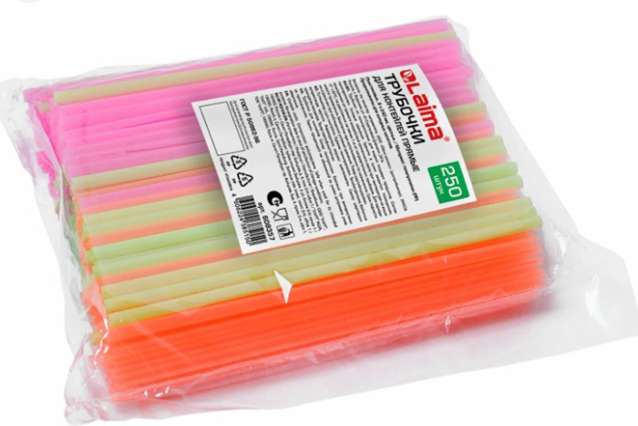 Трубочки для коктейлей прямые, пластиковые, 8х240 мм, цветные, КОМПЛЕКТ 250 штук, ЛАЙМА (608357)